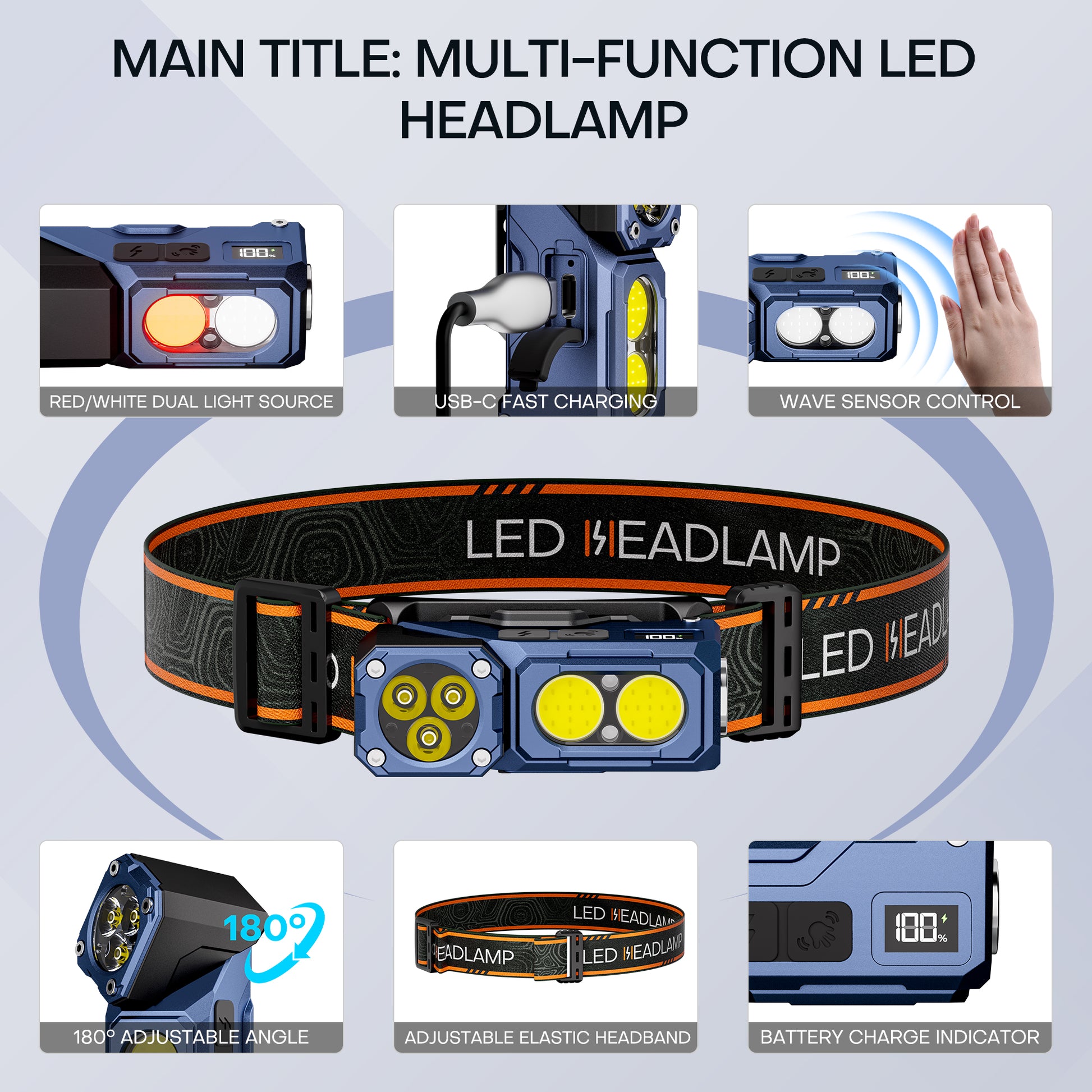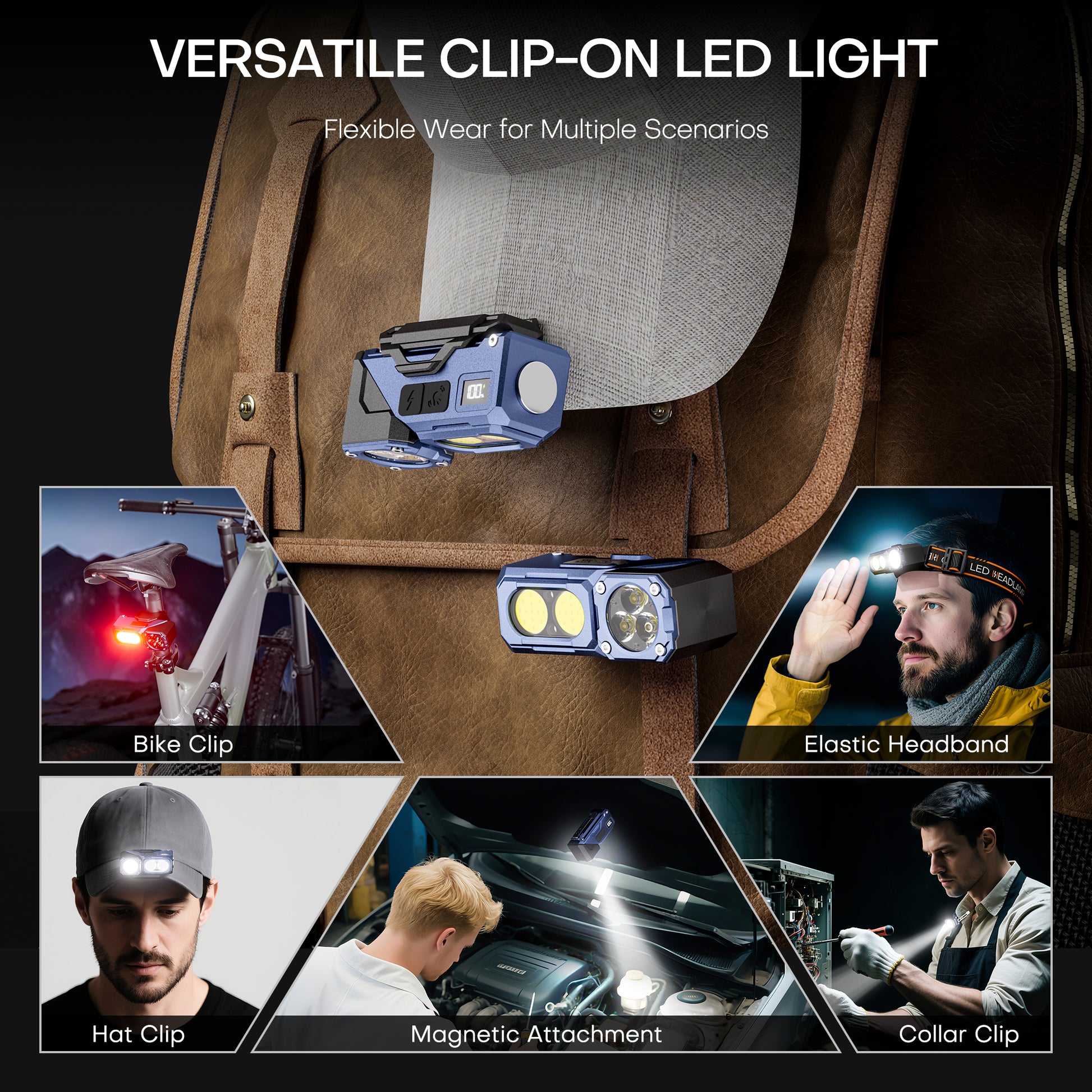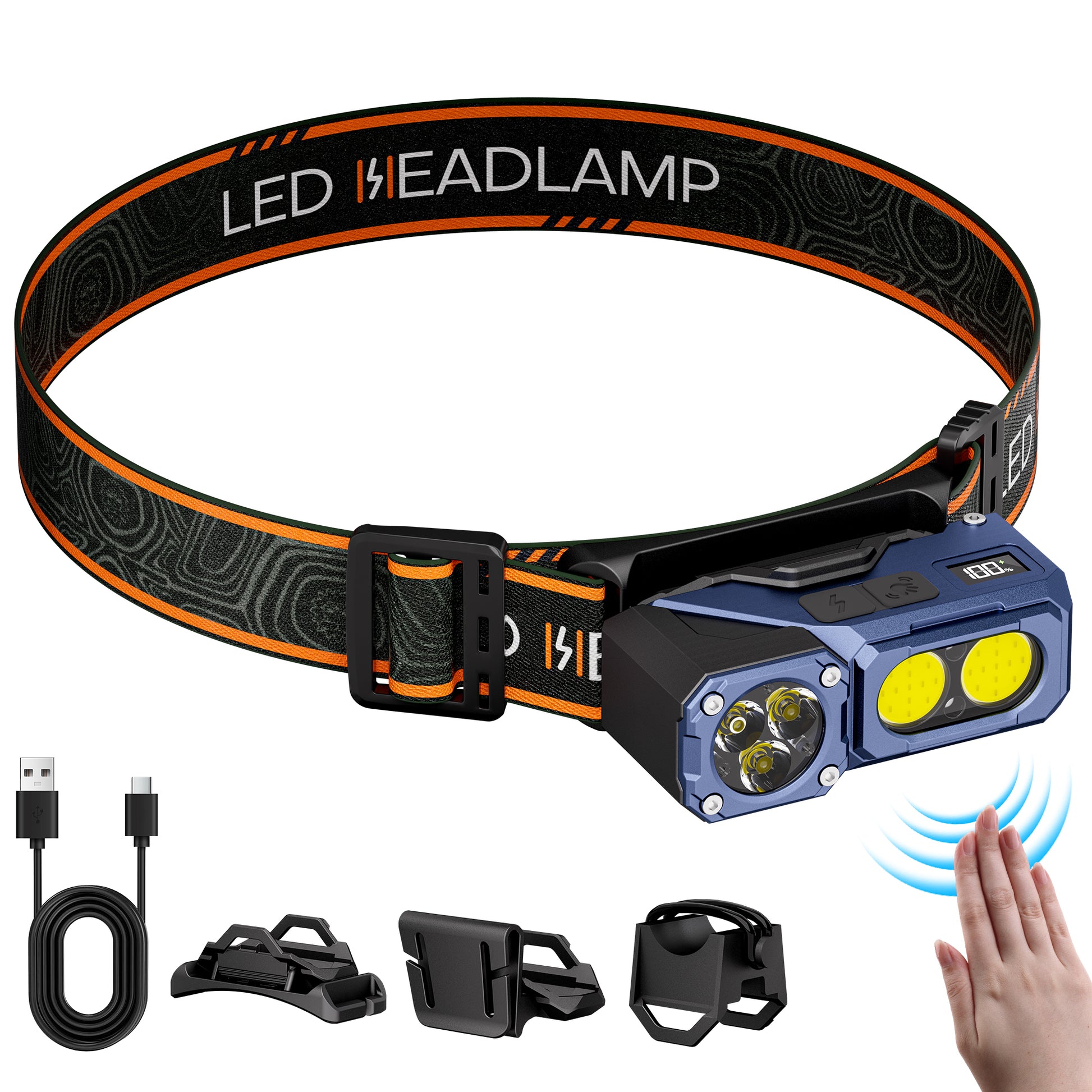 Multi-Functional Design for All Scenarios:Equipped with a hat clip, bike light buckle, head strap, and magnetic base, this headlamp can be used as a hat light, bike light, headlight, or work light. The innovative gesture - sensing feature allows for hands - free operation, adding convenience to your activities.600 Lumens Ultra-Bright with 7 Lighting Modes:Experience maximum illumination with 600 lumens, perfect for various outdoor adventures including hiking, camping, caving, and more. Switch effortlessly between 7 versatile lighting modes to meet different needs in any situation.Fast and Convenient TYPE - C Charging:Recharge your headlamp quickly and easily via the TYPE - C port. With a digital power display, you can monitor the battery level at any time. It only takes 2.5 hours to fully charge, ensuring you're always ready for your next adventure.Lightweight and Comfortable for Extended Use:Weighing just 2.96 ounces, this headlamp is incredibly lightweight and portable. The adjustable elastic head strap is sweat - absorbent, removable, and washable, providing maximum comfort during long - term use. The lamp head can be adjusted up and down by 45 degrees, allowing you to easily illuminate the road ahead.Magnetic Base and IPX5 Waterproof:The magnetic base at the bottom enables easy attachment to metal surfaces, making it an ideal work light. With an IPX5 waterproof rating, this headlamp can withstand splashes and light rain, ensuring reliable performance in various weather conditions.
