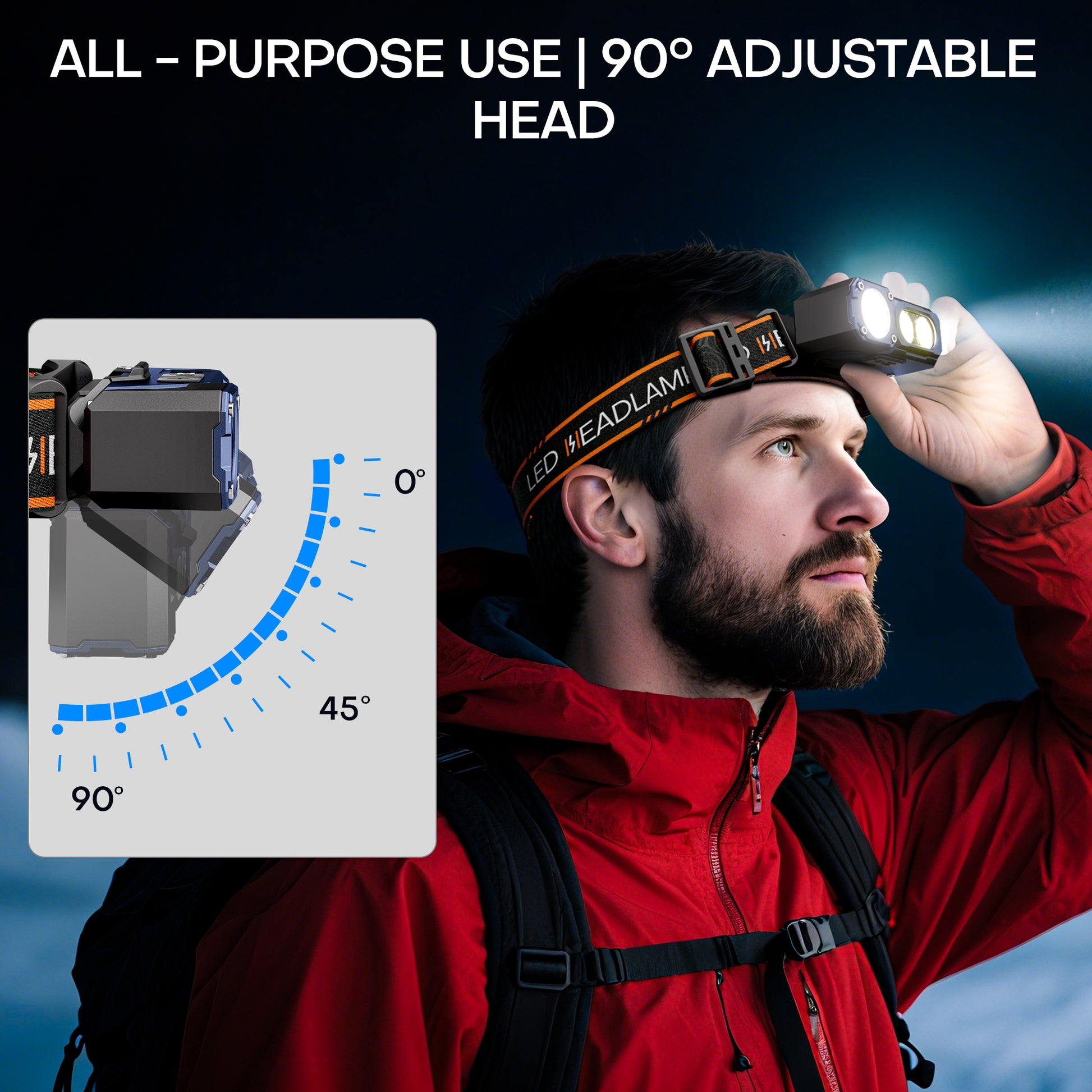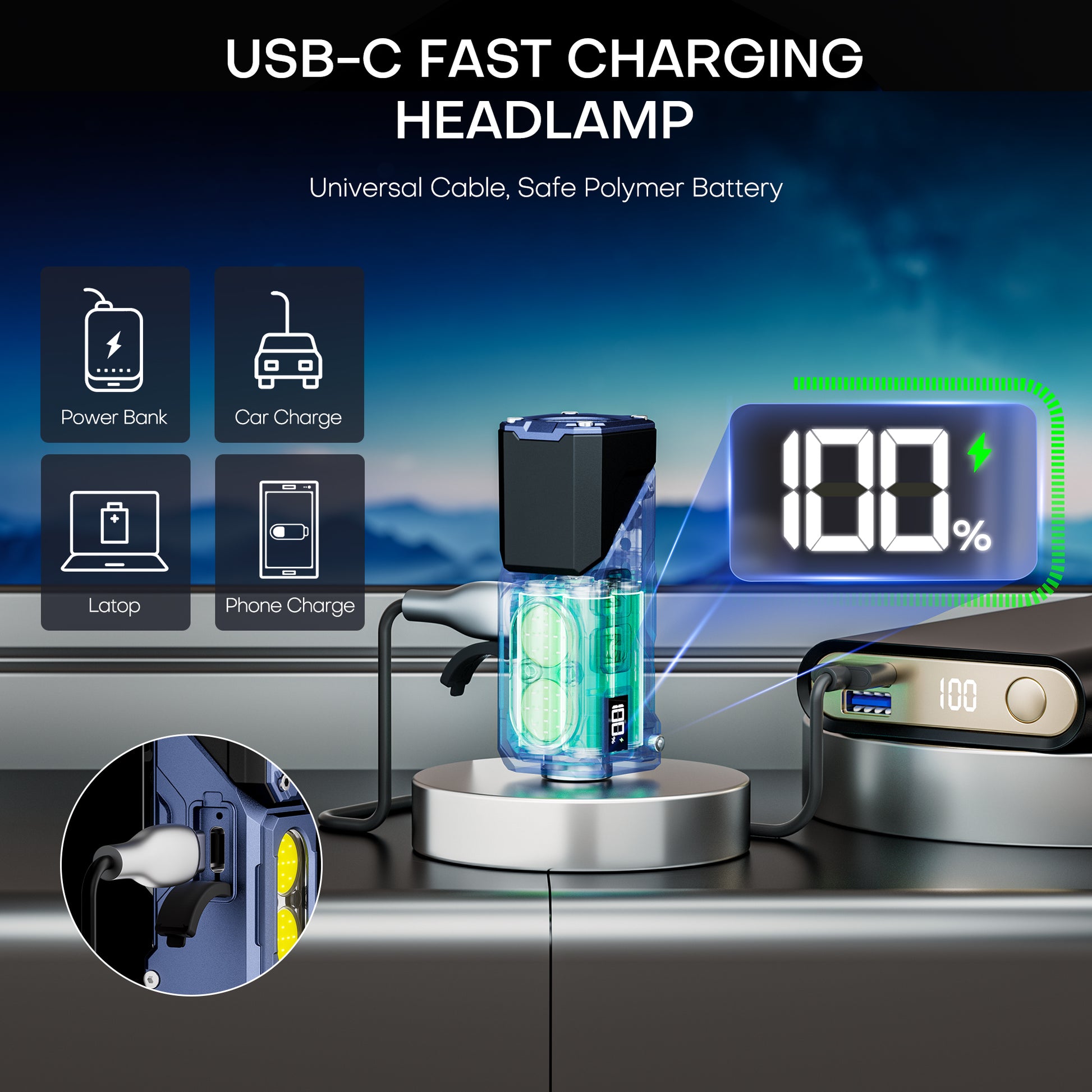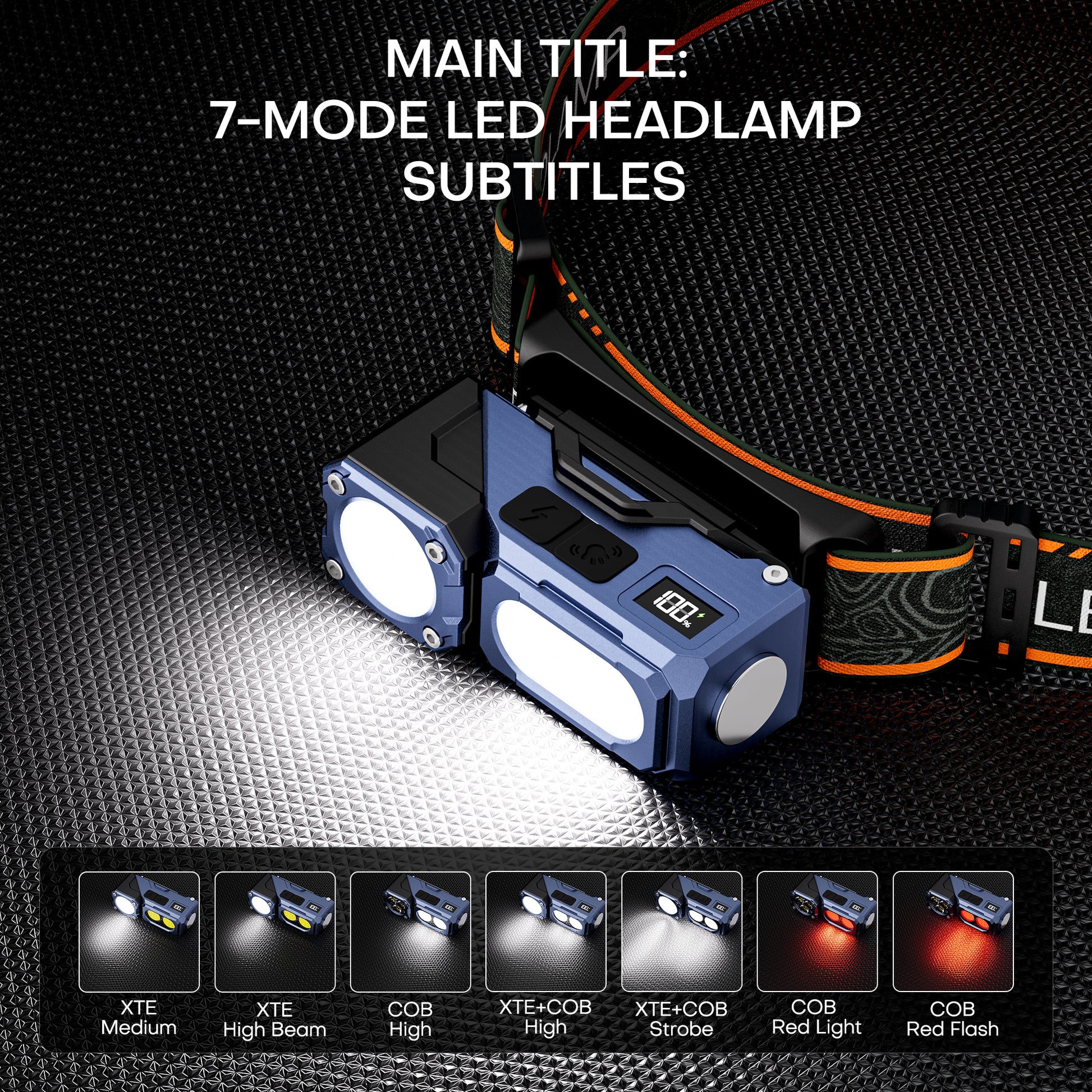 Multi-Functional Design for All Scenarios:Equipped with a hat clip, bike light buckle, head strap, and magnetic base, this headlamp can be used as a hat light, bike light, headlight, or work light. The innovative gesture - sensing feature allows for hands - free operation, adding convenience to your activities.600 Lumens Ultra-Bright with 7 Lighting Modes:Experience maximum illumination with 600 lumens, perfect for various outdoor adventures including hiking, camping, caving, and more. Switch effortlessly between 7 versatile lighting modes to meet different needs in any situation.Fast and Convenient TYPE - C Charging:Recharge your headlamp quickly and easily via the TYPE - C port. With a digital power display, you can monitor the battery level at any time. It only takes 2.5 hours to fully charge, ensuring you're always ready for your next adventure.Lightweight and Comfortable for Extended Use:Weighing just 2.96 ounces, this headlamp is incredibly lightweight and portable. The adjustable elastic head strap is sweat - absorbent, removable, and washable, providing maximum comfort during long - term use. The lamp head can be adjusted up and down by 45 degrees, allowing you to easily illuminate the road ahead.Magnetic Base and IPX5 Waterproof:The magnetic base at the bottom enables easy attachment to metal surfaces, making it an ideal work light. With an IPX5 waterproof rating, this headlamp can withstand splashes and light rain, ensuring reliable performance in various weather conditions.