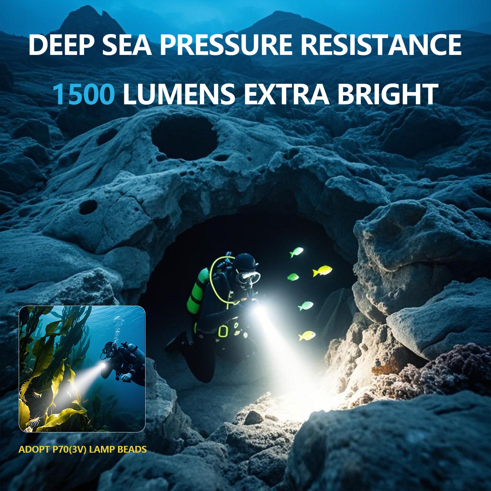 Ultimate Underwater Illumination: Experience powerful 1500-lumen brightness with a P70 LED, casting a focused beam over 350 meters for exceptional underwater visibility. Seamlessly switch to low mode for extended 15-hour battery life or activate the strobe for emergency signaling. Essential gear for scuba diving, night snorkeling, spearfishing, and marine photography. This is one of the most versatile underwater flashlights avai