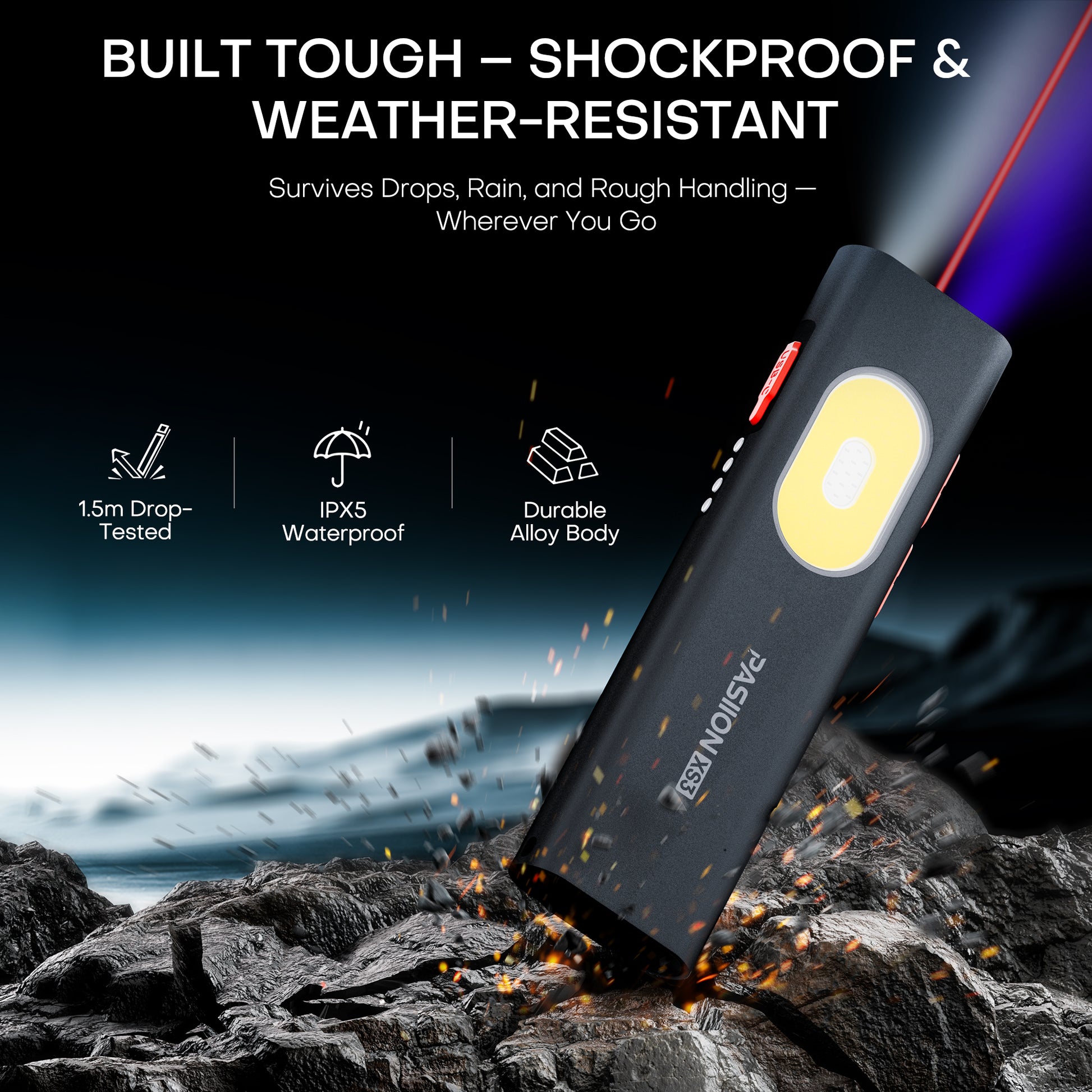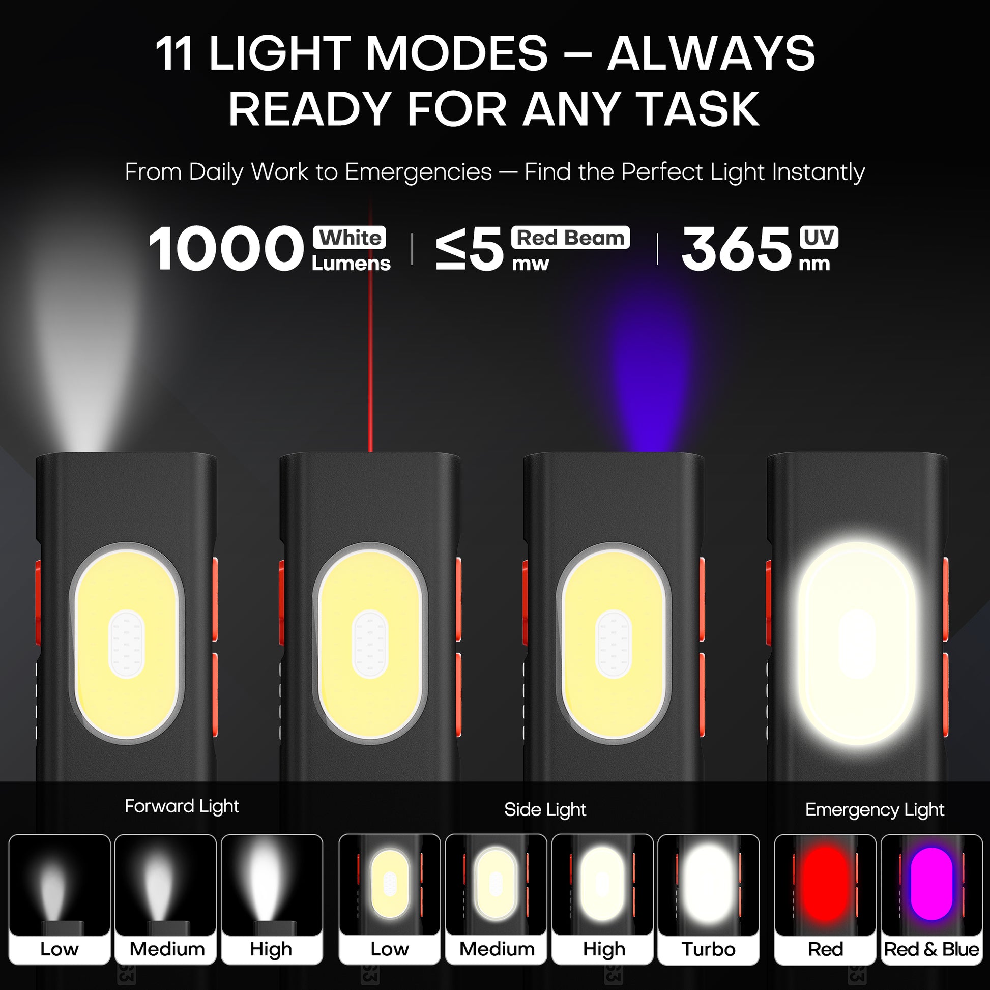 performance, versatility, and reliability in one tool, this compact edc flashlight delivers a powerful 1000 lumens of brightness in a slim, flat body that slips easily into your pocket, backpack, or glove compartment. More than a simple flash light, it features 11 lighting modes that adapt to every task: a strong white beam for visibility, a 365nm UV light to detect hidden stains and counterfeit items, a red laser pointer for signaling or pet training, and a full COB side panel offering soft white light, red illumination, and red-blue strobe for emergencies. Whether you're at home, outdoors, or on the road, this mini flashlight covers it all. With dual buttons for fast control, switching between modes is seamless—even with gloves. The built-in memory function remembers your last setting, saving time in repeated use. Hands full? No problem. The pocket flashlight attaches to any metal surface via its magnetic base, or clips easily to your hat or gear using the two-way clip—perfect for hands-free tasks like repairs, inspections, or walking the dog. This flashlight rechargeable model charges quickly via USB-C and features a real-time battery indicator so you’re never left guessing. Whether plugged into a wall outlet, laptop, car, or power bank, this small flashlight stays ready. Built with aircraft-grade aluminum, it’s IPX6 waterproof and 1.5m drop-resistant, tough enough to handle rough work, unexpected rain, or emergency situations. Whether you need a led flashlight for work, a flashlight with laser for utility, or a rugged pocket flashlight for daily preparedness, this all-in-one tool combines power, portability, and peace of mind in every use.